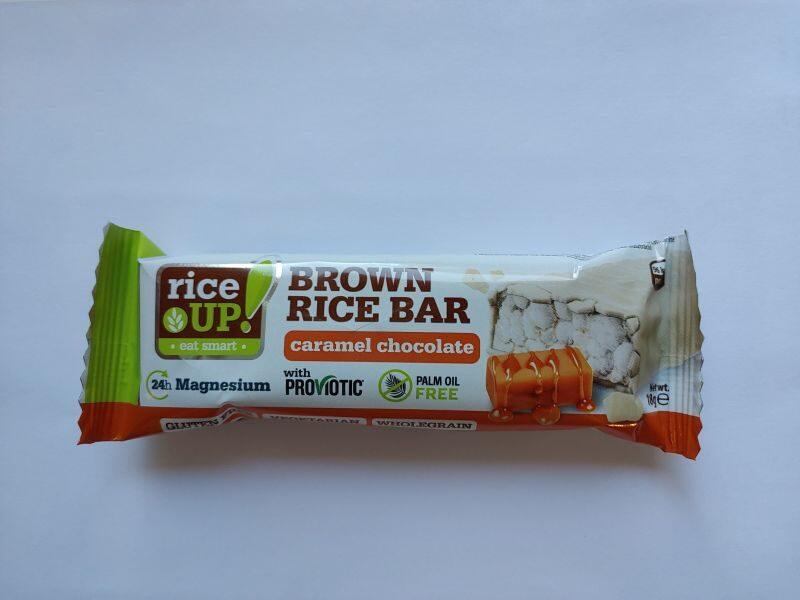 Rice Up puffasztott barna rizsszelet karamellás ízű fehércsokis bevonattal.